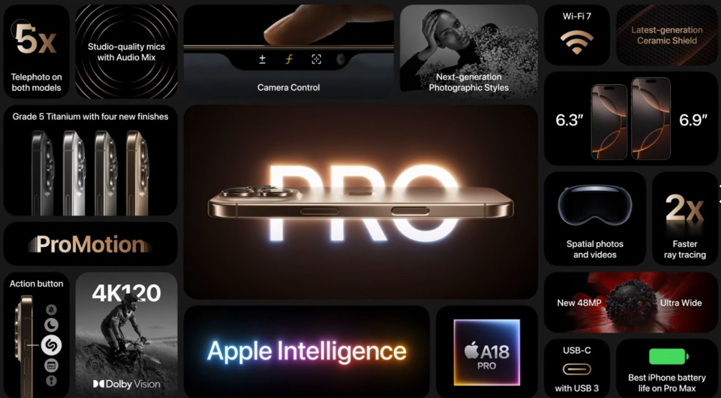 iPhone 16 serisinde ekran boyutları büyümüş durumda. Pro modelleri 6,3″ ve 6,9″ ekranlara sahipken, standart modeller 6,1″ ve 6,7″ ekran boyutlarında kalıyor. Ayrıca, telefonlar USB-C üzerinden 45W ve MagSafe ile 25W şarj hızlarına sahip.